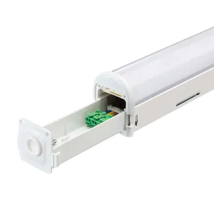 Questa reglette LED può essere utilizzata comodamente per l’illuminazione di spazi impegnativi o in linee di assemblaggio. Grazie al cablaggio entra/esci integrato, è possibile collegare diverse reglette al fine di formare una linea luminosa continua.